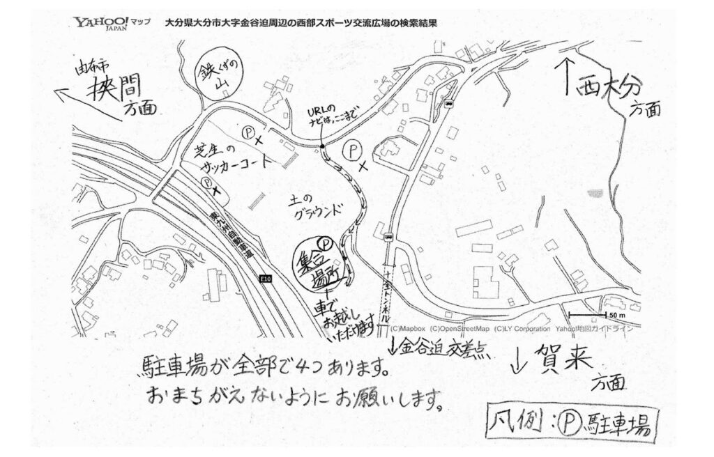 のうえんキャンプの集合場所について (!離島(海)キャンプは、集合場所が異なります。資料をよくご確認ください!) 集合場所について 集合場所:西部スポーツ交流広場(住所:大分市金谷迫)大分ICより車で5分 駐車場入口までの案内です。 https://maps.app.goo.gl/arjcgKhz8ysZXeQW8 下の地図をクリックすると印刷用PDFファイルが開けます。 集合場所までの地図ダウンロード のうえんキャンプ集合場所案内写真